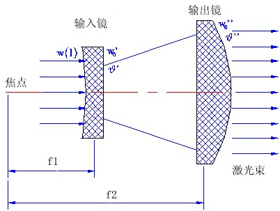 如右图所示,输入镜将入射的激光束聚焦在前焦平面上(虚焦点),新的束腰w?0 和发散角q?为
