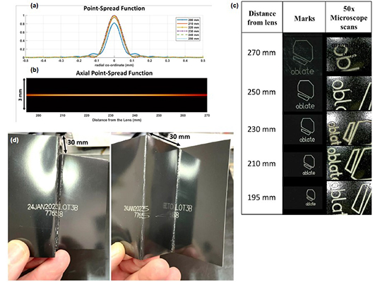 扩展景深(EDOF)平面透镜的性能如下图所示。在图 (a) 中,计算得出的点散射函数(PSF)显示了扩展景深范围内的良好聚焦效果。计算出的 Point-spread  function (PSF) 与镜头距离的函数关系也显示在图(b)中。图 (c) 右侧显示了距离镜头 195 - 270 毫米的标准黑卡标记测试以及标记的显微镜放大(50倍放大率)。目标距离发生变化时没有进行重新对焦。虽然由于工作距离的原因,标记的大小有所变化,但光斑的大小保持一致。在图(d)最下方的照片中,在一张折叠的卡片上进行了标准黑卡标记测试,卡片的两个表面相距 30  毫米。两个表面上的标记都清晰明确。