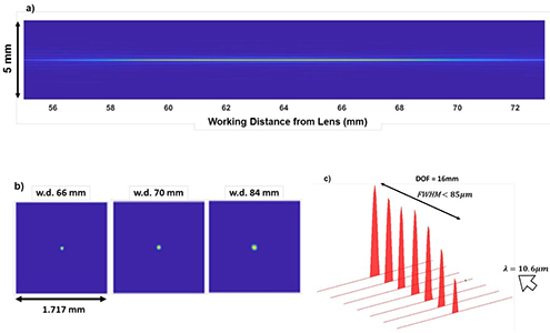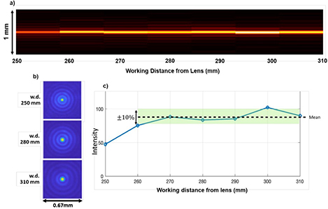 • c) 轴上光斑的峰值强度。沿工作距离的变化为+/-10%