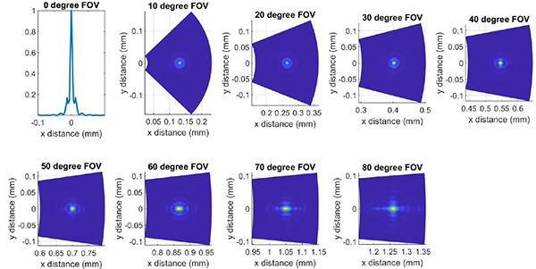 大视场TOF超透镜的性能如下所示,点扩散函数(PSF)在850nm处。PSF在80度的整个视场中显示出高性能聚焦。