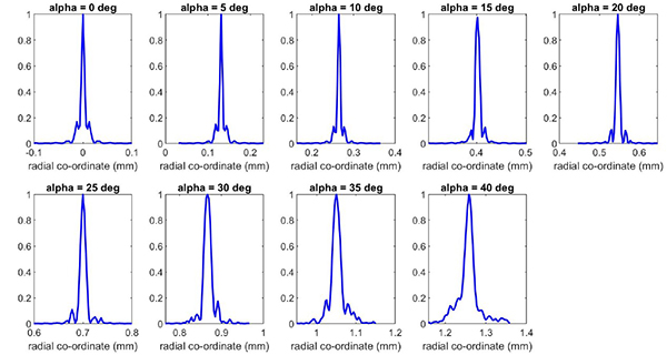 • b) 点扩散函数在距透镜三个距离处的实验数据