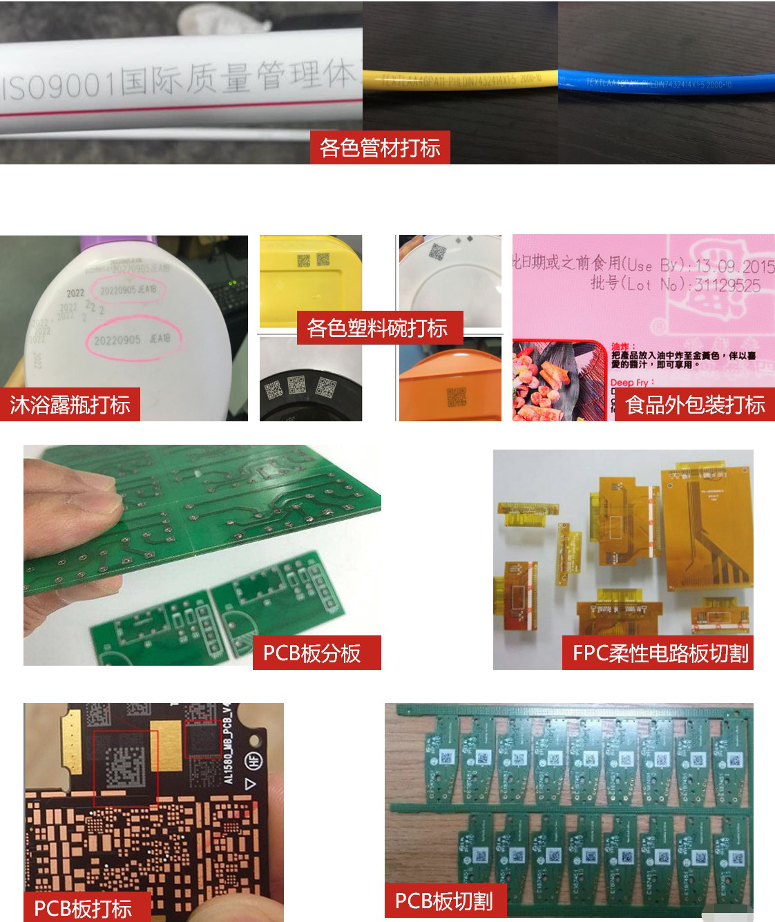 主要应用于3C行业标记、白色家电、电器外壳标记、食品、药品生产日期的飞动标记、3D打印、材料表层去除等领域。