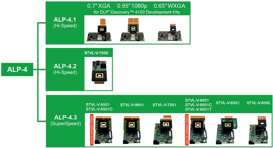 | 芯片组 | DLP7000 DLPC410 | DLP7000 DLPC410 | DLP9500 DLPC410 | DLP6500 DLPC910 | DLP9000X DLPC910 | DLP650LNIR DLPC410 |