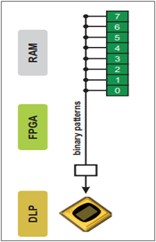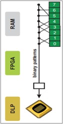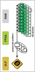 ALP-4支持通过使用帧查找表(FLUT)来进行间接帧选择。输出显示序列由存储在RAM中的模式组成,使用指向相应帧的FLUT条目。以这种方式,用户在生成显示序列方面具有最大的灵活性,并且可以通过仅仅改变FLUT内容来修改它们。在不将多个副本存储在RAM中的情况下,可以重复显示相同的模式,因此FLUT操作节省了上传时间和内存容量FLUT应用之一是通过德尔塔-西格玛方法进行灰度编码。
