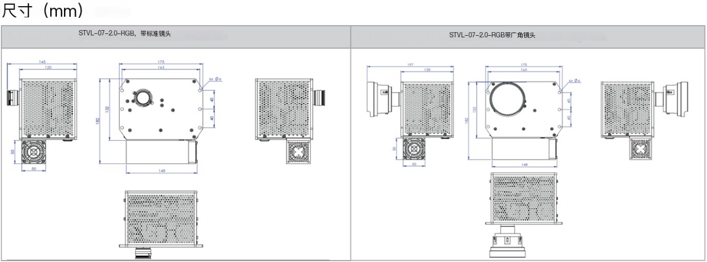 STVL-07-2.0-RGB投影仪,可选RGB,配备三个大功率LED光源和一个集成冷却系统。典型的用例是3D体积显示、3D测量、增强现实应用和机器视觉照明。除此之外,新出现的应用程序也得到了开放SDK接口的良好支持。STVL-07-2.0-RGB有两个镜头选项,一个是具有变焦功能的标准投影镜头,另一个是固定焦距的广角镜头。